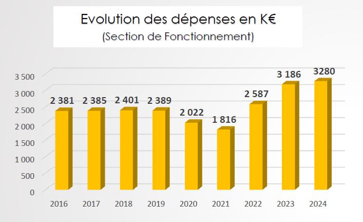 Une hausse de 37% des dépenses de fonctionnement entre 2019 et 2024, passant de 2 389 K€ à 3 280 K€.