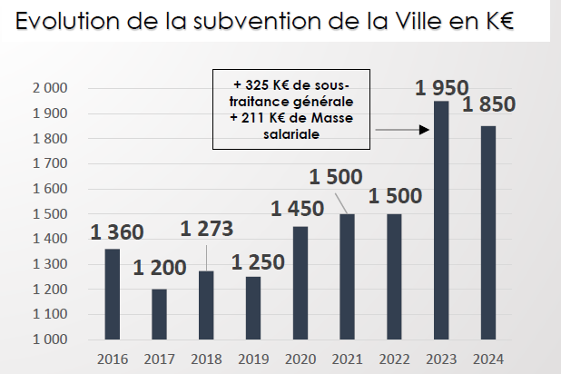 Les subventions municipales ont fortement augmenté, passant de 1 218 K€ en 2019 à 1 850 K€ en 2024.