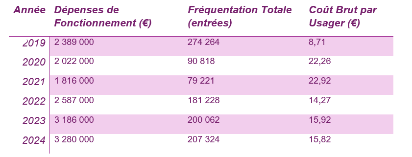 - Subvention municipale en 2024 : 1,85 M€, ce qui signifie que la Ville subventionne chaque entrée à hauteur de 9,72 € (différence entre le coût brut de 15,82 € et les recettes de 6,10 €).