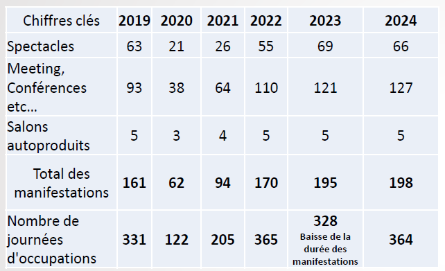 Les statistiques affichent une fréquentation exceptionnelle avec 364 jours d’occupation, 198 manifestations organisées (+17 % pour les salons) et des recettes en hausse de 10 % (3,55 M€).